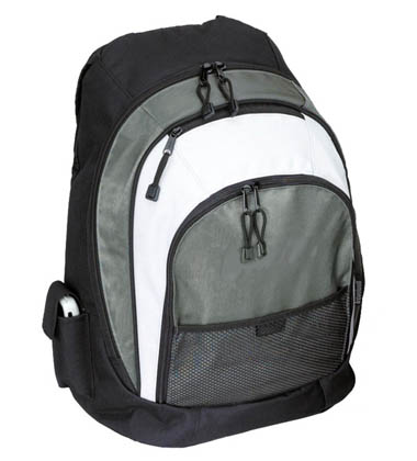 Mix of jacquard nylon and 600 denier polyester, this contemporary backpack is padded for a laptop. Numerous zip and open pockets to accommodate a PDA, calculator, pens and keys. Additional features include a zip pocket at the top, a phone and mesh pocket on the side and generously padded back and hand straps. With silk screened logo.