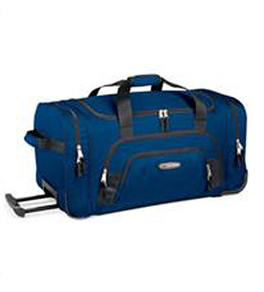 High Sierra rolling duffle in 600-denier Duralite®, with two top-loading end compartments, and a zippered front accessory pocket. Telescoping handle with roller blade easy moving wheels. Pratt Industries logo on a zipper pull.