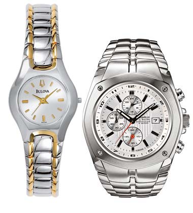 Stainless steel, men’s chronograph, two-zone silver dial, domed crystal, water resistant to 165 feet. Woman’s with 8 diamonds, black patterned dial, stainless steel, water resistant to 165 feet. With engraved logo.