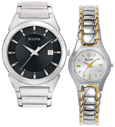 Stainless steel, fold-over buckle. Man's with Japanese quartz movement, blue dial, water resistant* to 165 feet. Woman’s two tone with curved crystal, is water resistant* to 100 feet. *Water resistant means they withstand rain and splashes of water, but NOT showering or submersion.