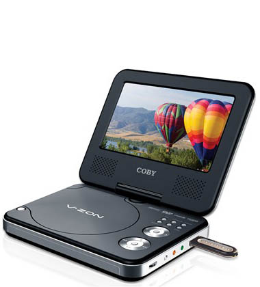 7" color display, DVD, DVD+-R/RW, CD, CD-R/RW, JPEG & MP3 compatible. Plays digital MPEG-4 video files & digital media files. Includes remote, AV cable, rechargeable battery, stereo headphones, headrest mounting bag. USB stick NOT included.