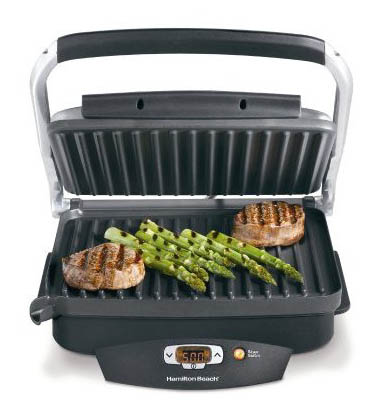 Hamilton Beach Super Sear, moist tender results in under 10 minutes. Drains fats into removable drip tray. 100 square inch nonstick surface.