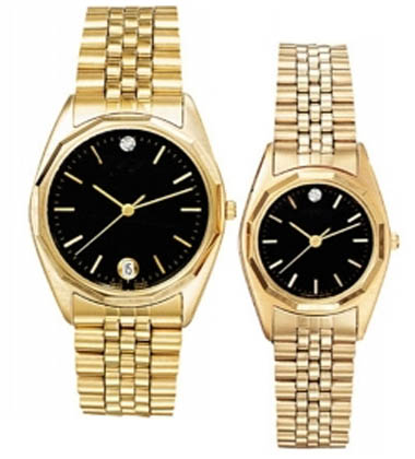 Goldtone on stainless steel, Marine Star with diamond accent, second hand, mans with date, either is water resistant to 100 feet.