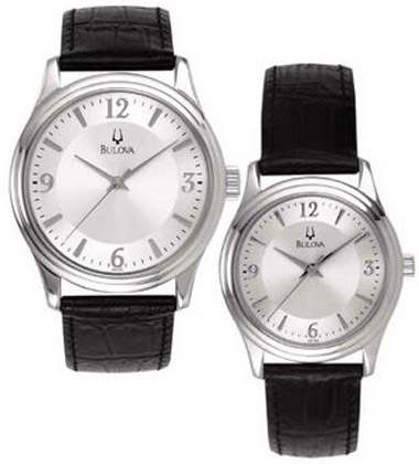 Silvertone dial and bezel, black leather strap, second hand.