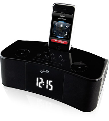 iLive works with iPhone & iPod (not included). AM/FM radio, dual alarms, snooze, sleep timer. Wake to iPhone / iPod, radio, or buzzer, gradual wake. Line input (3.5mm). audio/video output. Remote control. Supports universal docking brackets.