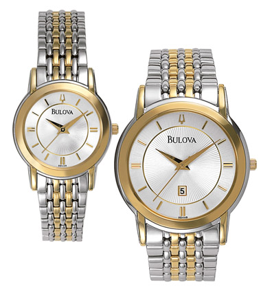 Goldtone on stainless steel, second hands, deployment buckles, man’s with date, water resistant to 100 feet.