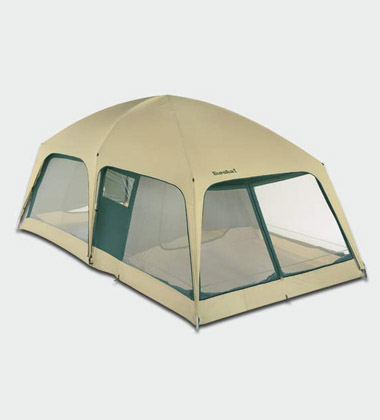 Ulitmate luxury tent for family camping, three doors, ten windows, two rooms with center privacy area make this tent a joy to camp in. Eureka!® hub, shockcorded eaves, clips, freestanding frame, and ring and pin assemblies make set up easy. All major seams have been factory taped and sealed