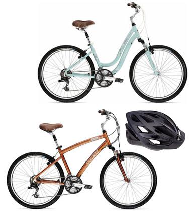 - Includes 2 bikes (1 men’s and 1 women’s Navigator 2.0) and 2 Trek Vapor helmets. The Navigator 2.0 lets you enjoy scenic streets and fun trails in comfort. Its relaxed frame design and adjustable stem put you in a back-friendly, upright riding position. The suspension fork, shock-absorbing seatpost, and comfort saddle soak up the bumps for a smooth ride. Comfort tires, and quick-shifting 21 speed Shimano / SRAM drivetrain guarantee efficient riding. Vapor helmets offer the protection you need with style and comfort.
