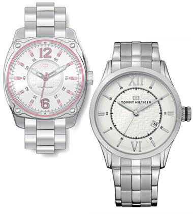 Man’s: stainless steel case and bracelet, white enamel dial with a TH center zone and Hilfiger logo. Date display at 4:00, Arabic numerals and markers, mineral crystal, water resistant to 99 feet, 3 hand movement. Woman’s: stainless steel case and bracelet, Hilfiger logo. Mineral Crystal, water resistant to 99 feet. Face differs from picture. 2011 watch face is white, with stainless steel numbers and markers.