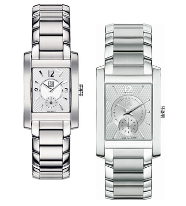 Man’s: Stainless steel case and bracelet. Textured silver dial with hour markers, subdial at 6 o’clock, mineral crystal, deployment clasp, water resistant to 99 feet.Woman’s: Solid stainless steel case and bracelet. Textured silvertone dial, second hand subdial at 6 o’clock, mineral crystal, deployment clasp, water resistant to 99 feet.