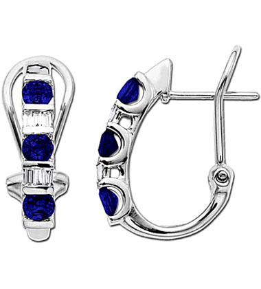 Alternating diamonds and sapphires are set in 14K white gold for a satiny finish. Pierced posts with hinged clips secure the earrings. Alternating diamonds and sapphires are set in 14K white gold for a satiny finish. Pierced posts with hinged clips secure the earrings.