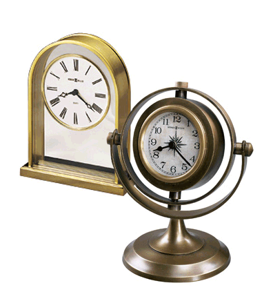 Gimbal Clock - Howard Miller rugged, antiqued solid brass table clock with convex glass crystal & quartz battery operated movement. 7 3/4 x 6 1/2 x 4 1/2| Reminisce Clock - Howard Miller, refined, brass finished arch with polished brass finished edges and base. Cream colored dial is set within a clear acrylic crystal. Quartz movement includes battery. 7-1/4 x 5-3/4 x 2