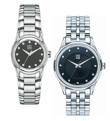 Mans with stainless steel case and bracelet. Black dial with diamond markers. Mineral crystal. Water resistant to 99 feet.Womans with stainless steel diamond set case and stainless steel bracelet. Black dial with diamond markers. Anti-reflective mineral crystal. Swiss quartz movement. Water resistant to 99 feet.
