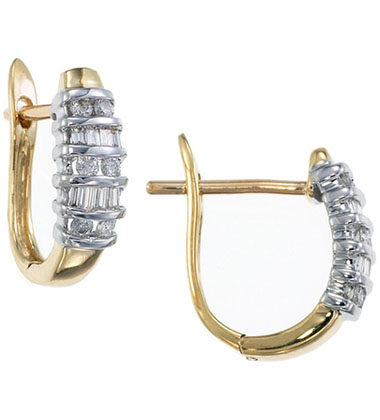 14K gold and white gold hoop earrings feature light-catching round and straight baguette diamonds. The contrasting metals offer a sophisticated setting for the sparkling diamonds. Sturdy bar-and-catch closures keep the earrings secure.