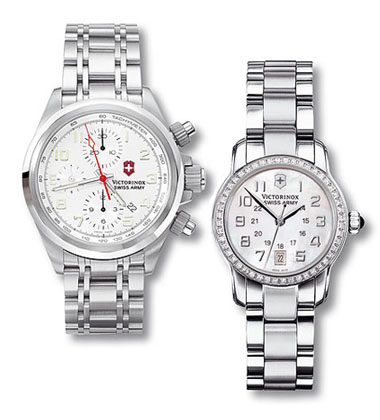 and hour markers, water resistant to 330ft. Women’s: stainless steel, Swiss-made quartz movement, scratch-resistant hardened sapphire crystal, full-cut diamonds, mother-of-pearl dial with date window, water resistant to 330ft, push-button deployment clasp.