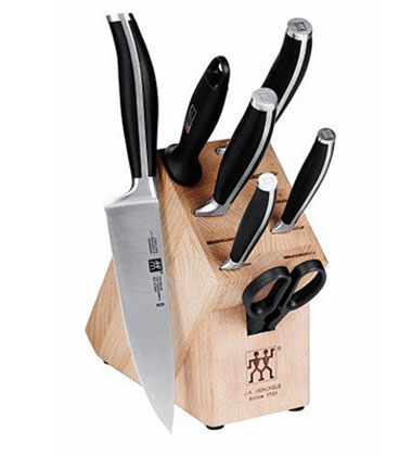 JA Henckels eight piece set includes: 3 vegetable, 4 parer/utility, 5 serrated/utility, 5 Santoku hollow edge, 8 chefs, 9 steel, kitchen shears and wood block. Friodur ice hardened for a long lasting edge. High precision forging, innovative ergonomic handle. Full horizontal tang without rivets-no gaps, smooth shape. Sanitary, break-proof and colorfast. High carbon, no stain steel blades, long lasting cutting edges.
