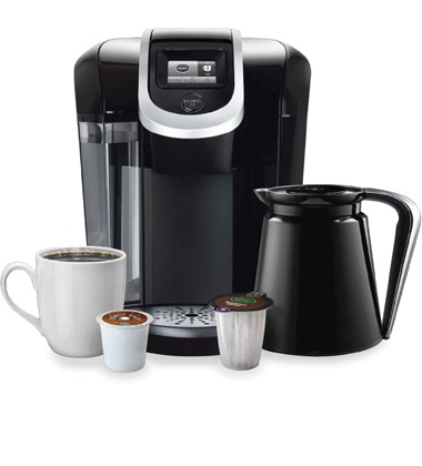 Brews single K-Cup pack and 4-cup K-Carafe pack, grayscale touch display, 60oz water reservoir, 9 brew sizes range from 4oz to 30oz. Includes 4-cup starter carafe, 4 K-Carafe packs, 6 K-Cup packs, water filter starter kit & 1 water filter.
