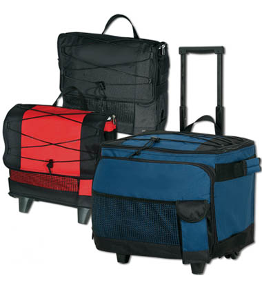 600d nylon, IceŽ 54-Can Cooler with leak-proof and tear-resistant, double-sealed lining. Telescopic handle and in-line type roller wheels, folds down for easy storage. Lifetime guarantee.