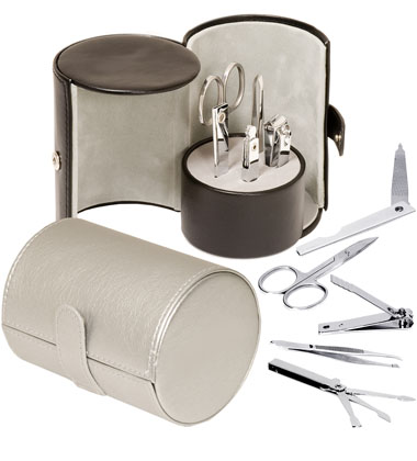 Synthetic leather case snaps closed. Comes complete with high-quality manicure scissors, folding nail file, tweezer, nail clipper and 3-piece folding cuticle tool.
