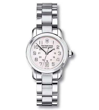 Womans Mother-of-Pearl Vivante. Made in Switzerland with precision Swiss analog quartz movement, mother-of-pearl dial, stainless steel case with screw-in caseback, sapphire crystal, cabuchon crown, date, water resistant to 10 ATM (100 meters/330 feet), stainless steel bracelet with push-button deployant clasp, 28mm case diameter.