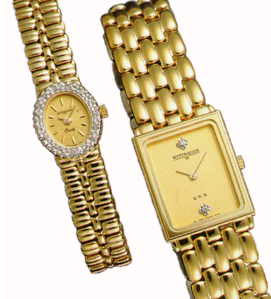 Wittnauer Diamond Watch - Mans with 2 diamonds, womans with 8 diamonds, both are water resistant to 100 feet and feature precision Swiss quartz movements, sapphire crystals and cases finished in in 23 karat gold.