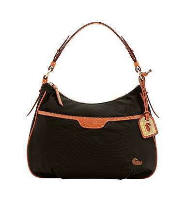 Dooney & Bourke, nylon with leather trim, one outside zip pocket, one outside pocket with magnetic snap, one inside zip pocket, two inside pockets, cell phone pocket, inside key hook, zipper closure.