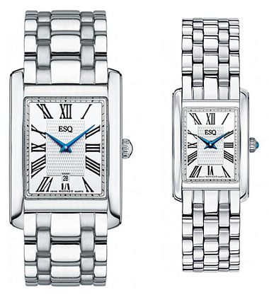ESQ by Movado, stainless steel, silver textured dial with richly textured center. Roman numerals and blue hands on dial. Date, mineral crystal, deployment clasp. Water resistant to 99 feet. Swiss made.
