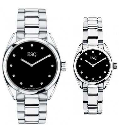 ESQ by Movado, stainless steel, black dial with diamond markers, deployment clasp, mineral crystal, Swiss Quartz movement, water resistant to 99 feet.