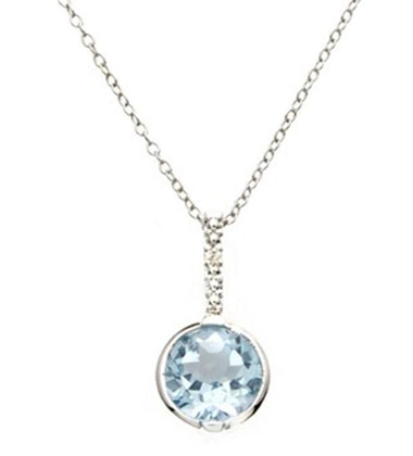 A splash of diamonds in a sea of brilliant blue waters. Blue topaz pendant with diamonds. 10mm bezel set genuine round blue topaz with .01ct. round diamond set in sterling silver, 18" cable chain.