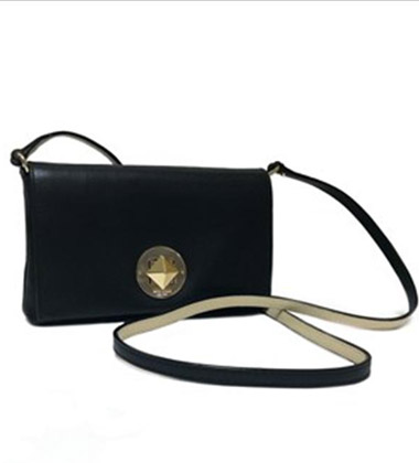 Bightspot Avenue Sally, black, buttery soft leather, compact crossbody with pyramid turnlock closure and interior wall pocket.