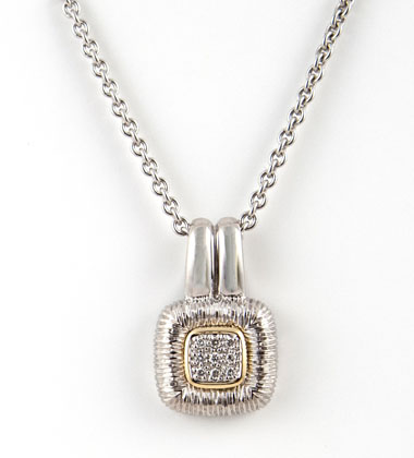 Sterling silver and 14K yellow gold diamond square pendant features .06 ctw pave diamonds, bezel set inside a rim of 14K yellow gold, hung from an 18" sterling silver box chain.