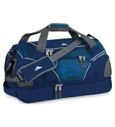 High Sierra, large main compartment with U-shaped zippered opening for easy loading. Drop-bottom wet compartment keeps gear organized. Exterior compression straps. Zippered front compartment with MP3 pocket. Durable webbing handles with Vapel mesh wrap. Adjustable shoulder strap. Embroidered PBD logo.