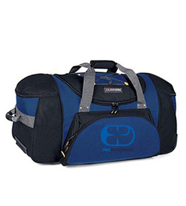 High Sierra rolling duffle in 600-denier Duralite®, with two top-loading end compartments, and a zippered front accessory pocket. Telescoping handle with roller blade easy moving wheels. Embroidered PBD logo.