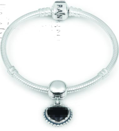 Sterling sliver Pandora bracelet with Pandora Clasp features the Mi Amor black onyx dangle heart clip charm. Please note your size when ordering, allow extra length if you plan to add more charms.