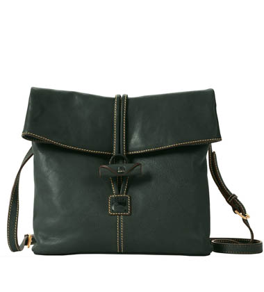 Medium Florentine Crossbody, made of sumptuous Italian leather with handcrafted artisan details, brushed gold plated hardware. Red cotton lining edged in green suede, outside zip pocket, one inside pocket, one inside zip pocket, inside key hook, adjustable detachable strap, toggle closure. Black with dark brown stitching.