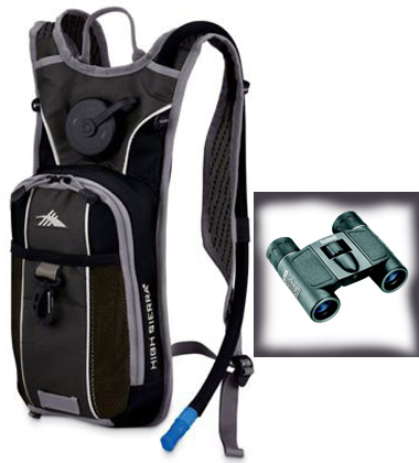 Hydration Pack & Power View Binoculars - High Sierra, holds 2-liter water reservoir. Easy access, accepts most water filters, pocket for your bicycle tools, accessories or CD/MP3 player. Binocular: 10x25 magnification, multi-coated optics, non-slip rubber armor.