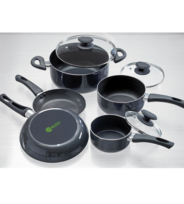 Includes: 9.5" & 11" fry pans, 1.5 qt & 3 qt saucepans with glass lids and 5 qt dutch oven with glass lid.