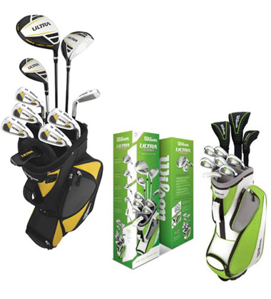 Men’s RH or LH Ultra: 2 woods (1, 3) with graphite shafts, 1 Hybrid (4) and 7 irons (5-SW) True Temper steel shafts, alignment putter, dual strap stand bag.