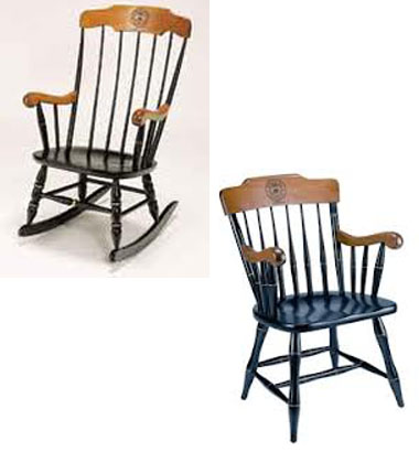 College Captain’s Chair or College Rocker - Made entirely of solid maple hardwood in the USA, hand painted gold beading, comfortable scooped and saddled seat, body of chair painted a handsome satin black. Deep etched medallion with LGH logo. Captain’s chair dimensions: 181/4” D x 23” W x 34 1/2” H. College Rocker dimensions: 27” D x 23” W x 40 1/2” H.