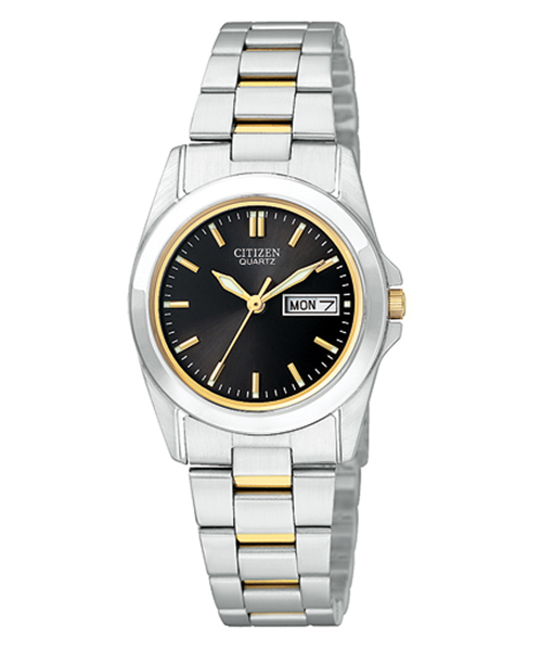 Quartz in two-tone stainless steel with black dial featuring day and date. Stainless steel fold clasp with push button. Mineral watch movement: Quartz 1102, water resistant.