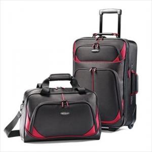 2400D polyester, 17” x 11” x 7” tote and 21” x 14” x 7” upright with in-line skate wheels.