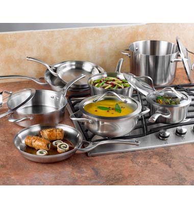 Crafted from lustrous, brushed stainless steel, sleek curved vessel, tri-ply performance, full aluminum core for superb conductivity and even heating, dishwasher safe, stay-cool handles, tempered glass covers, lifetime warranty. Includes: 8” omelette pan, 10” omelette pan, 12” omelette pan, 1.5 qt sauce pan w/cover, 2.5 qt sauce pan w/cover, 3 qt saute pan w/cover, 3 qt chefs casserole w/cover, 8 qt stock pot w/cover. Induction capable.