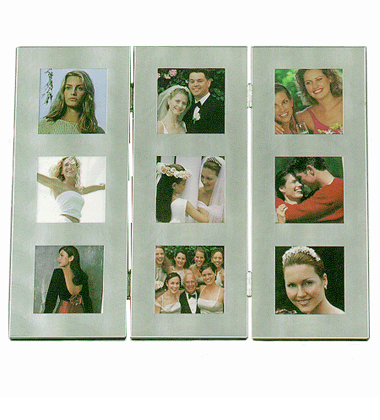 Triptic Picture Frame - 3 panels brightly plated and polised panels are hinged to stand on desk, each window holds a 3 x 3 photo.