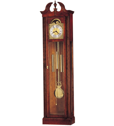 Howard Miller Chateau Grandfather Clock - Polished brass finished dial, fixed midnight blue moon phase accents the dial, cherry finish on select hardwoods and veneers, chain-driven, Westminster chime Kieninger movement with chime silence option