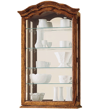 Glass-mirrored back beautifully reflects each collectible, four adjustable glass shelves, mount on the wall or set on a mantel or bookcase with a specially designed “no-tip” base. Cherry or medium oak finish on select hardwoods and veneers. 33 1/2 x 20 x 8 1/4