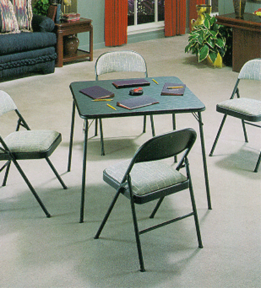 Folding Table and 4 Chairs - Meco by Samsonite, black lace mutted finish on the sturdy steel frames, graphite vinyl table top, padded tweed seats and backs on all 4 chairs.