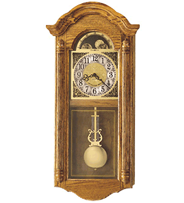 Fenton Howard Miller Quartz Wall Clock - Polished brass finished dial with silver chapter ring and fixed blue moon phase, lyre pendulum, gold tone detailing on glass, finished in Golden Oak on select hardwoods and veneers, dual chime movement plays Westminster or Ave Maria chimes, features volume control and automatic nighttime chime shut-off option. 28-1/2 x 13-1/2 x 5