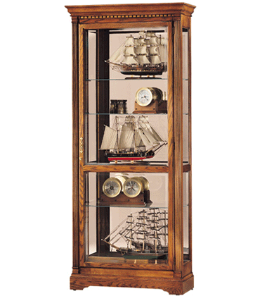 Howard Miller Collectors Curio Cabinet - Reeded columns with wooden column caps frame the beveled glass door, medium oak finised select hardwoods and veneers, adjustable levelers under all corners, illuminated, adjustable glass shelves and No-Reach™ on/off light switch located on the back of the cabinet