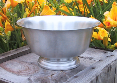 Soft satin finished lead-free pewter. Classic, hand finished, 8 diameter centerpiece bowl. Made in US by Web Pewter.
