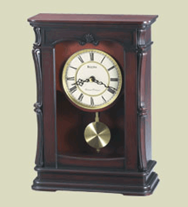 Solid wood case, walnut finish, carved wood accents, German movement plays Westminster or Ave Maria chimes on the hour. Night shut-off.